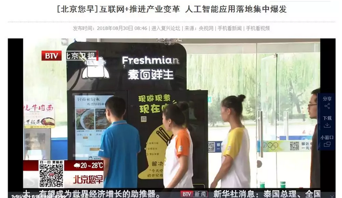 2018年8月30日早,萬杰智能熟面機(jī)在北京衛(wèi)視的《北京您早》欄目中亮相,與智能音箱、在線教育等產(chǎn)品一起,向公眾展示人工智能技術(shù)研發(fā)與產(chǎn)業(yè)應(yīng)用的最新進(jìn)展。 https://v.qq.com/x/page/k077205p6na.html