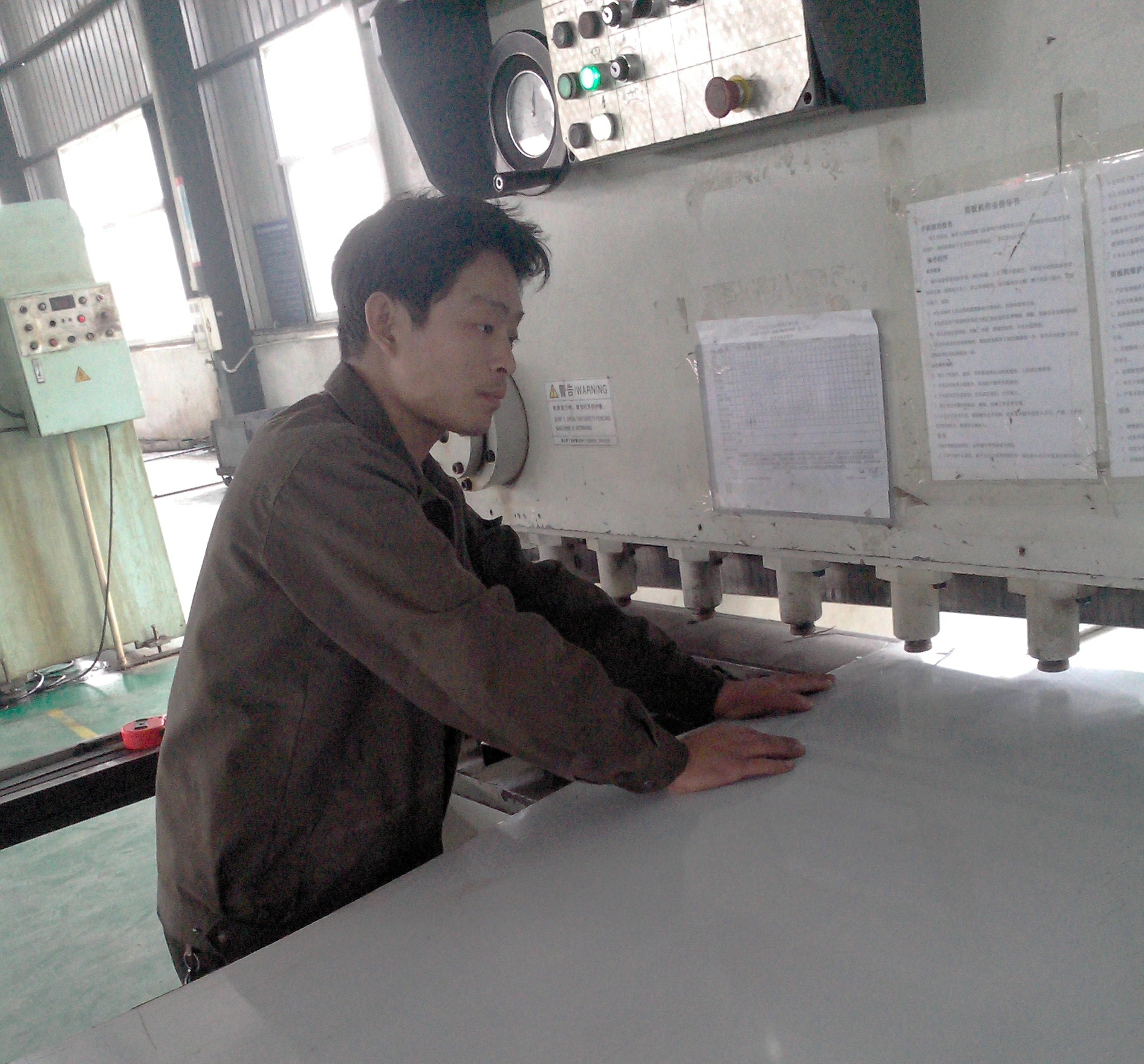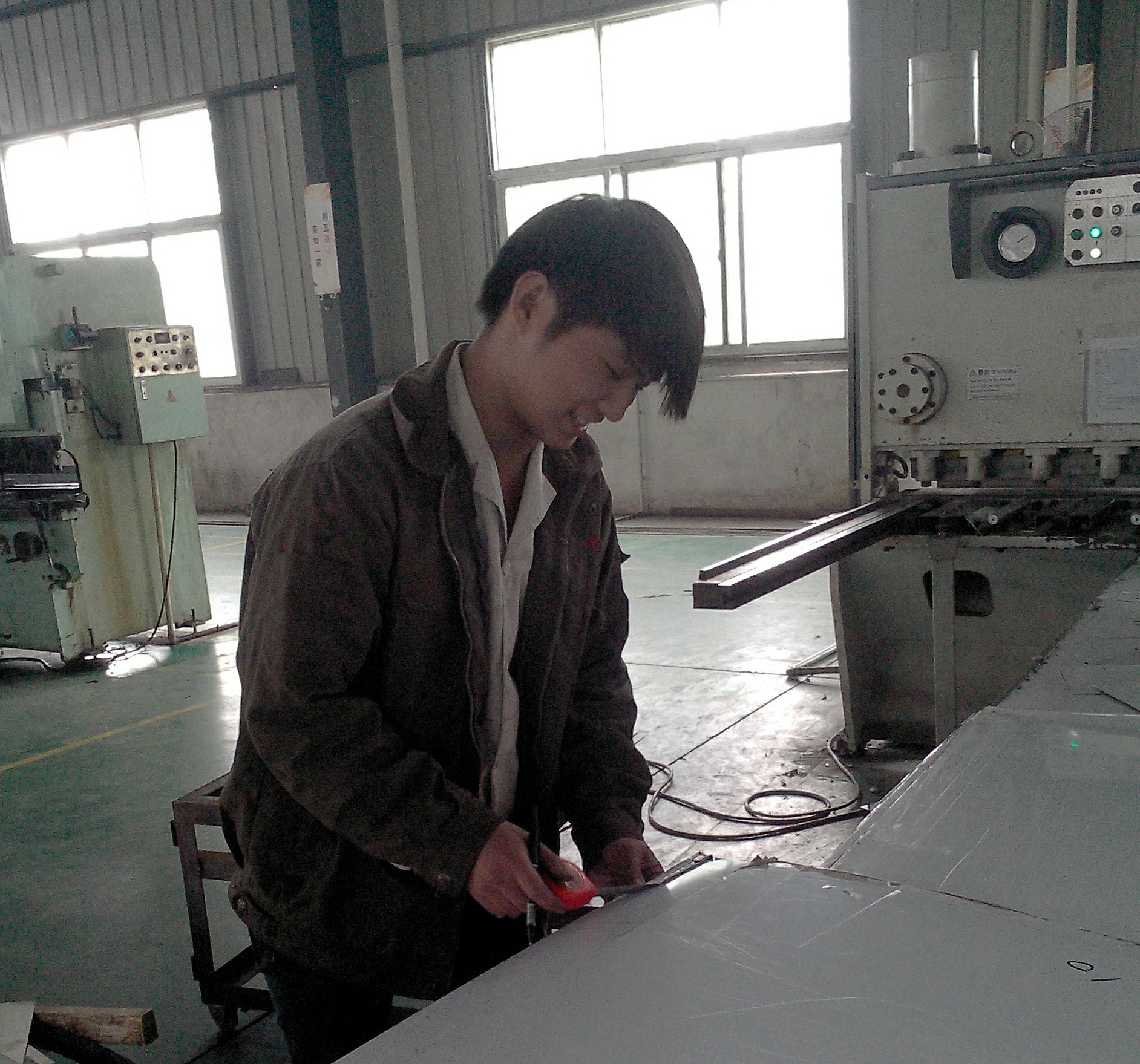 鈑金車間職工趙旭峰和李迎光兩位同志,分別于1212月份和134月份入職。利用自己掌握鈑金技術(shù)和經(jīng)驗(yàn),在外購(gòu)聰明象車間自由撞擊門(mén)的基礎(chǔ)上進(jìn)行了優(yōu)化制作:為了達(dá)到外觀美觀大方,給自由撞擊門(mén)加裝了寬包邊,雙折彎打密封膠這樣既美觀又結(jié)實(shí);用“十”字不銹鋼螺絲將包邊和門(mén)框鎖在一起,解決了門(mén)框和墻體的空隙,同時(shí)也便于拆裝;節(jié)約材料將門(mén)頭的一根槽鋼節(jié)省下來(lái),同時(shí)也達(dá)到了強(qiáng)度需要;自己掌握了自由撞擊門(mén)的角度數(shù)據(jù)可以設(shè)計(jì)不同尺寸的門(mén),這樣自己制作同樣尺寸大小門(mén)成本節(jié)約了60%左右。