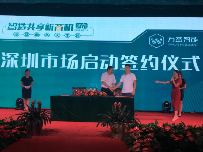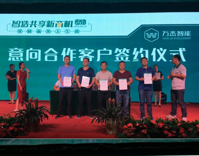 晚宴即將開始時,仍然有很多意向合伙人想要加入萬杰智能鮮面機(jī)項(xiàng)目中來,會務(wù)組因此臨時調(diào)整會議流程,推遲晚宴開始時間,為意向合伙人留出更多簽約時間,最終,萬杰智能成功與30余位意向合伙人簽署了意向合作書。 萬杰智能與中視能量(央視一級服務(wù)商)簽訂戰(zhàn)略合作協(xié)議 萬杰智能深圳市場正式啟動儀式 城市合伙人簽約儀式