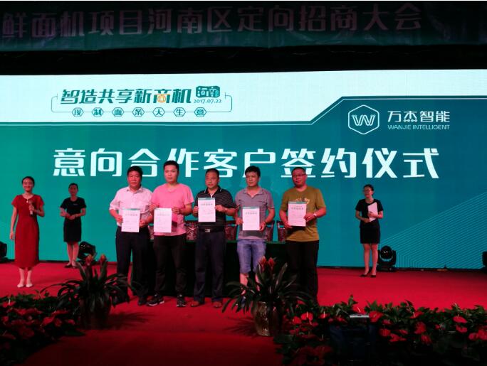 7月22日,智造共享新商機(jī),萬杰智能鮮面機(jī)河南大區(qū)定向招商大會在許昌成功落下帷幕。超過70家意向合伙人(170余人)齊聚本次招募大會,當(dāng)天有30余家意向合伙人簽訂合作意向書。